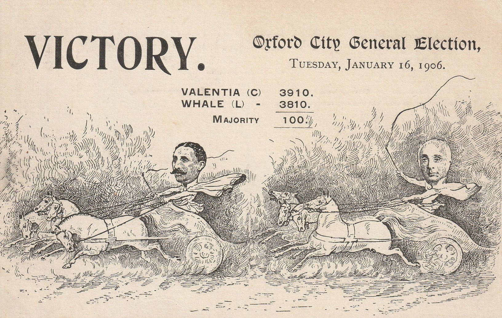The 1906 General Election saw a landslide victory for the Liberals who won 397 seats in parliament. The Conservative Party had its worst ever result winning only 156 seats. This PC depicts the result in Oxford where Arthur Annesley, 11th Viscount Valentia, the Conservative candidate, narrowly defeated the Liberal candidate, George Whale.