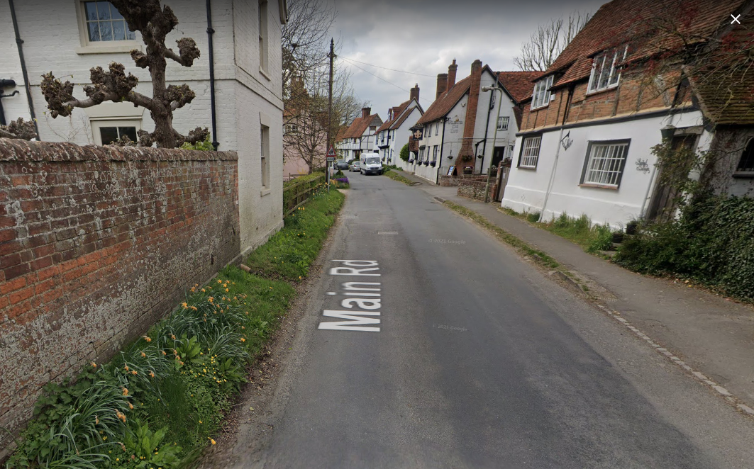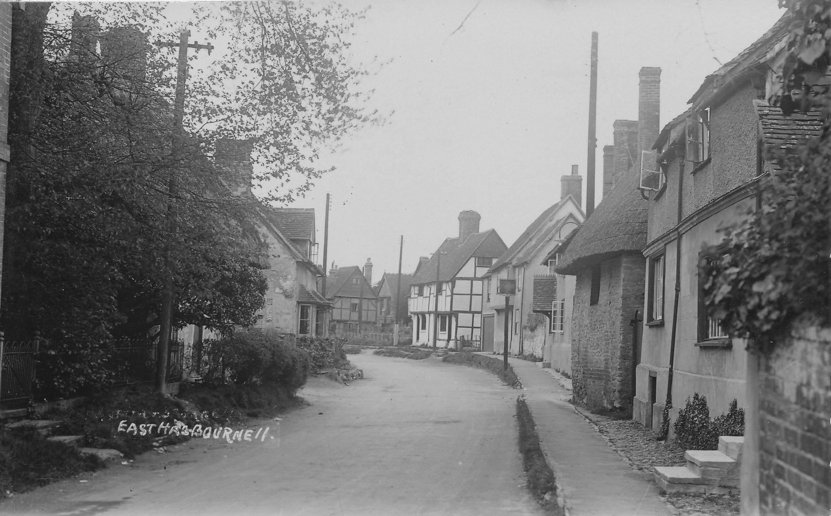 The view is of Main Road, outside number 26, looking towards the church (more up-to-date view left). The first house on the right is now Sundial Cottage and the Fleur de Lys pub is a couple of doors down - the cottages between no longer exist.