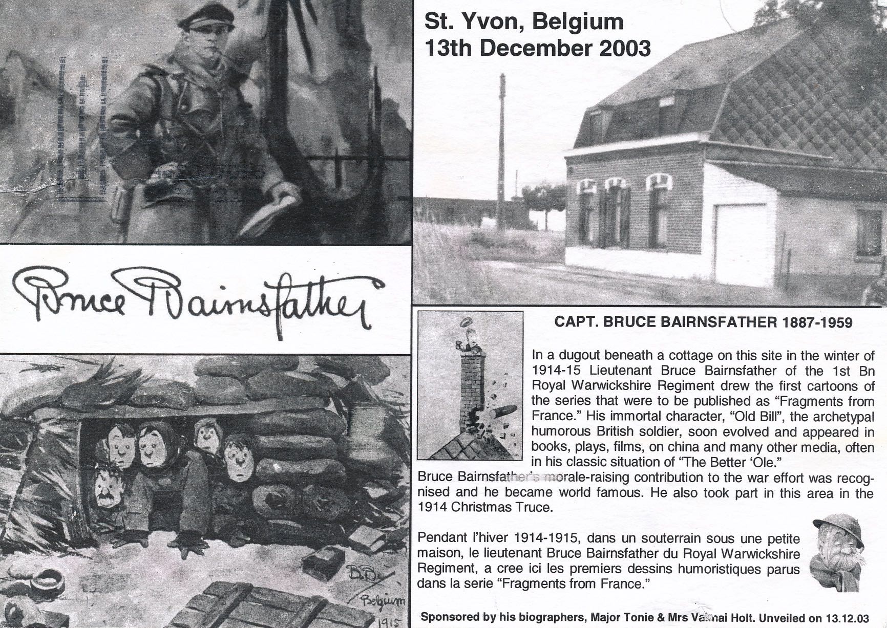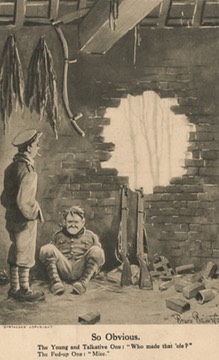 Bruce Bairnsfather (1887-1959) - Captain Bruce Bairnsfather was a British humourist and cartoonist during WW I. Prior to the war, Bairnsfather who was born in India, worked as an electrical engineer, then drew advertising sketches for Lipton’s tea, Players’ cigarettes, Keen’s mustard and Beecham’s pills. In 1914, he joined the Royal Warwickshire Regiment and served with a machine gun in France.