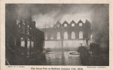 Photograph by J.C. Brown, published as a postcard by G.H. Stonebridge of Midland Road, Bedford, showing the destruction by fire of the premises of Longhurst and Skinner on Midland Road in January 1912.
