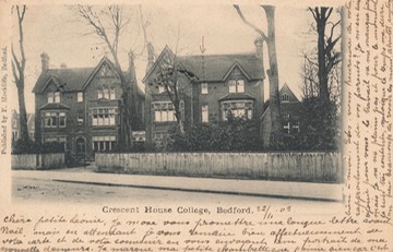 The school had a resident French teacher (possibly the writer of this card - franked Bedford and Versailles in 1903 - the arrow points to her “petite chambrette") and the master who taught German at the two boys schools also taught German at the Crescent School. In 1913 Mrs Carroll retired (she died at Eastbourne on the 31st December 1940 aged ninety) and the school was taken over by Miss Flora Jane Fry, English teacher at the School, and Miss Laura Hammond, who had been a pupil at the school, and they re-located the school to 11 Linden Road. In 1925 Miss Fry retired and she died in Bedford in September 1941.