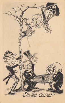 The image appears to show the Allies attempting to capture Kaiser Wilhelm and his son, Crown Prince Wilhelm, in Holland in 1918/19 following the conclusion of the Treaty of Versailles. The people shown - numbers added to version on the right - are, I think :
