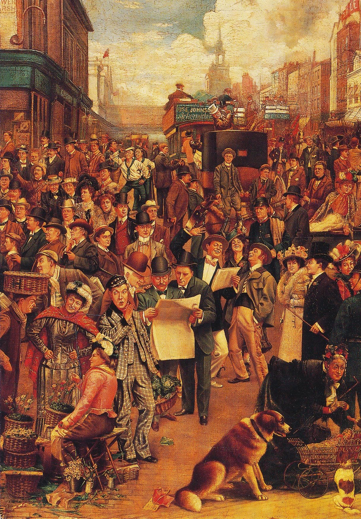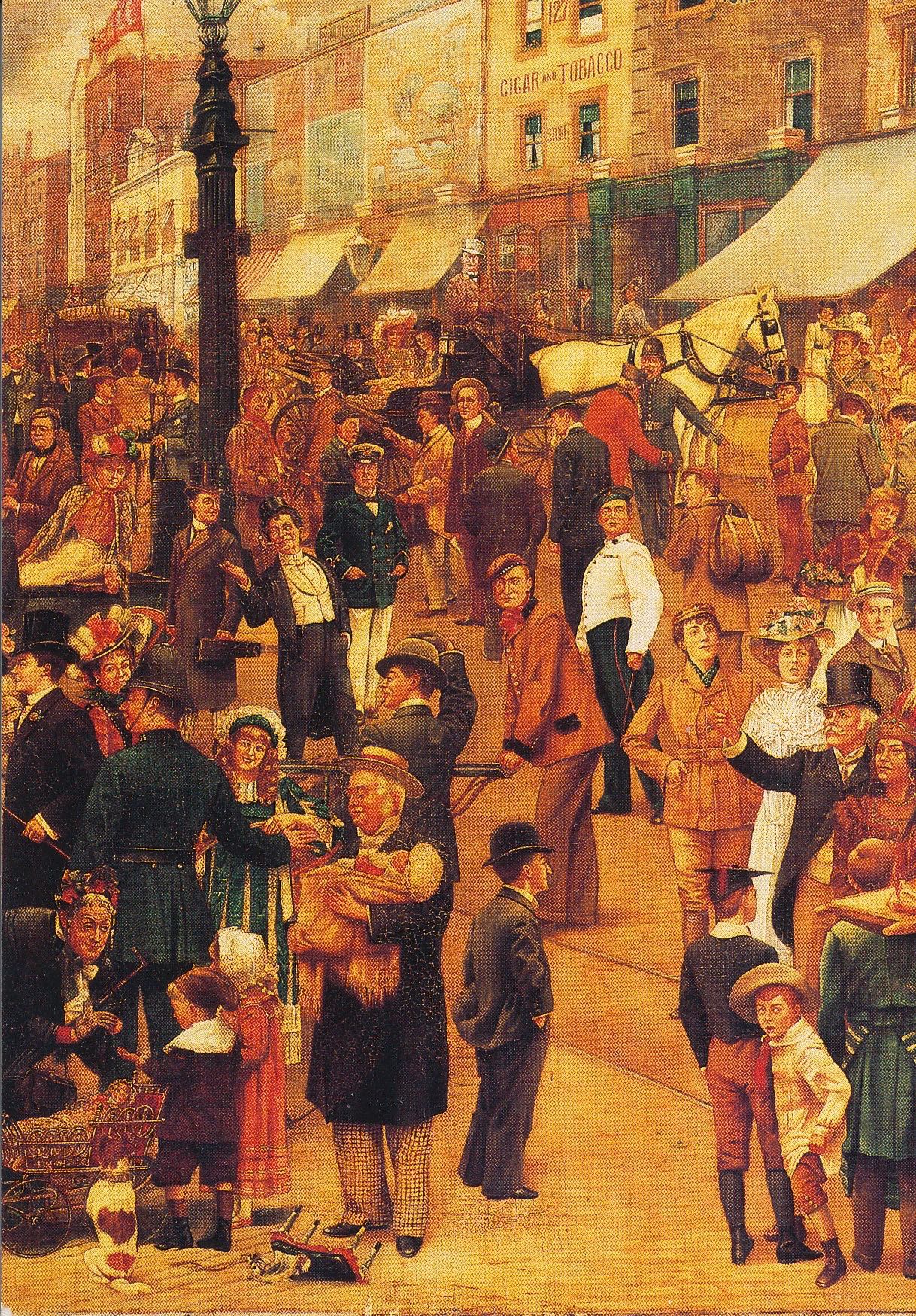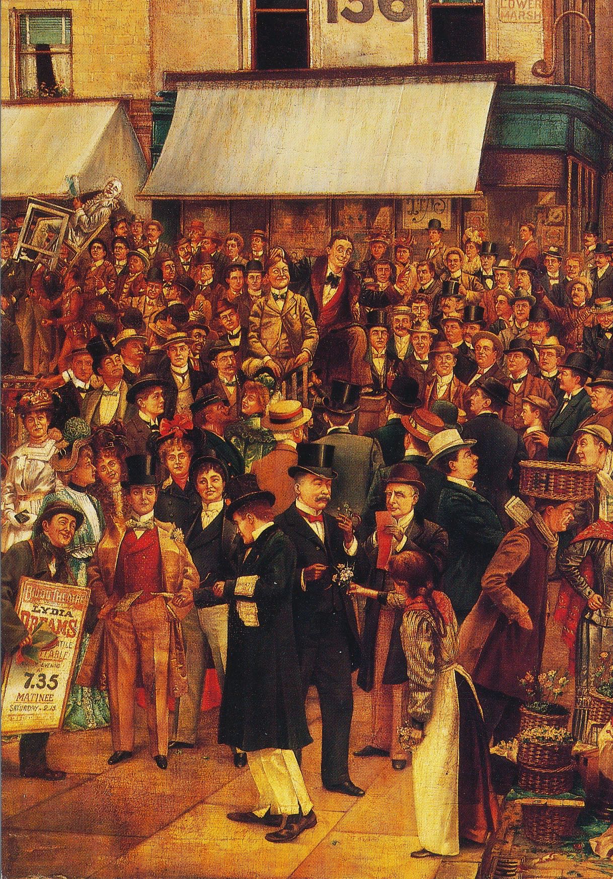 Three unused postcards published by the Museum of London making up a composite portrait of the leading music hall performers of the early 1900s. The scene is the Waterloo Road near the Old Vic Theatre.