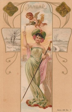 A series of German Art Nouveau postcards, publisher unknown (Series 366), with romantic designs representing the months of the year.