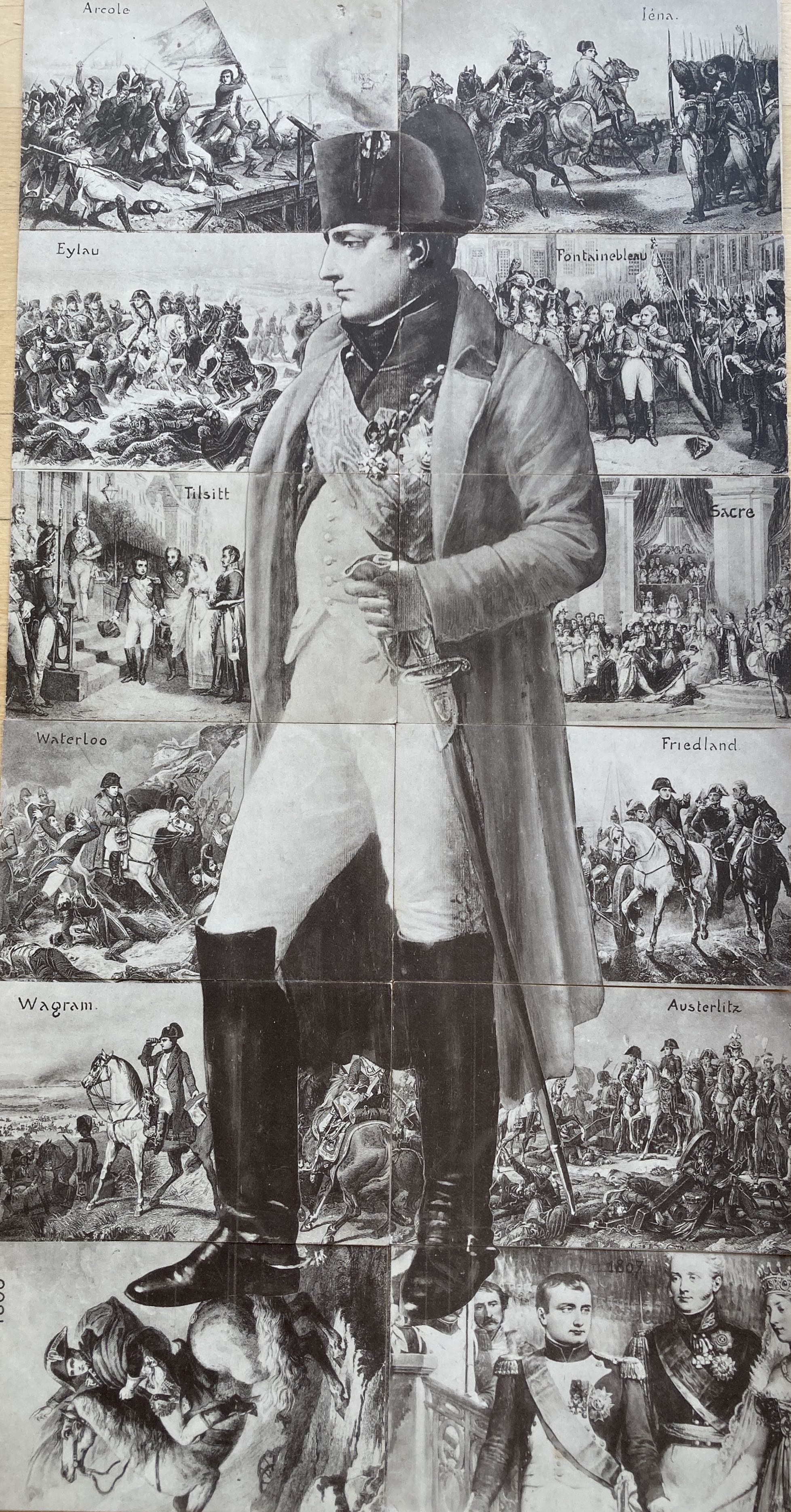 A set of 12 monochrome postcards (unused) - PC_Puzzle-Napoleon - depicting incidents from Napoleon’s military career mainly during the period 1800-1807. The incidents depicted are (a) the battle of Arcola (1796), (e) his coronation (Sacre) (1804), (j) the battle of Austerlitz (1805), (b) the battle of Jena-Auerstedt (1806), (c) the battle of Eylau (1807), (h) & (e) the battle of Friedland and the treaties of Tilsit (1807), (i) the battle of Wagram (1809), (d) the farewell to the old guard at Fontainebleau (1814) and (g) the battle of Waterloo (1815).