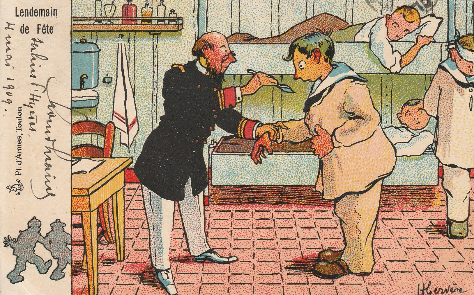 Apparently one of an extensive pre-WWI series “Nos Marins” illustrated by H Gervère and published by Raffaelli at Toulon, which is a large naval base